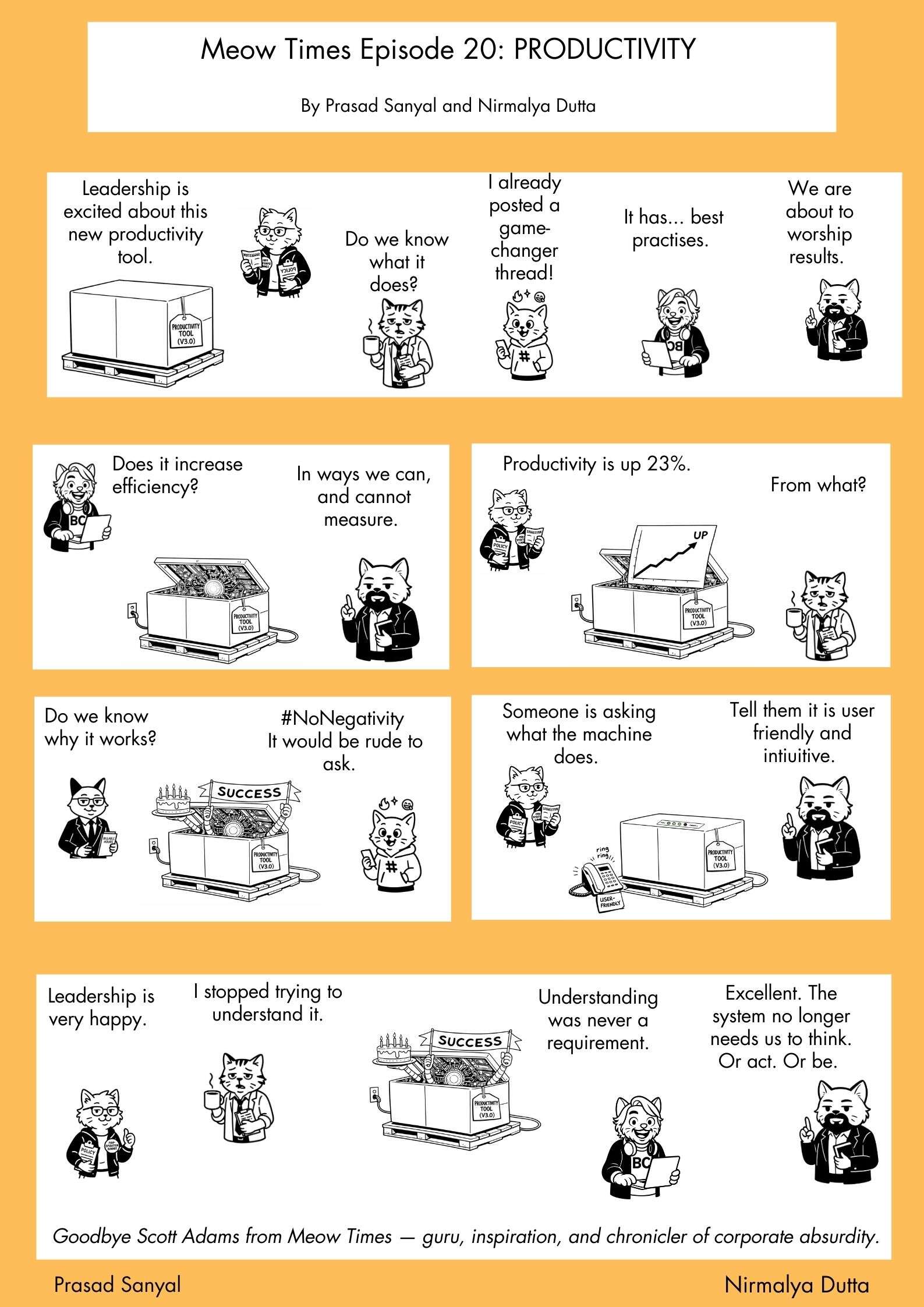 What made Adams unique was his firm grasp of the absurdity of the capitalist machine, and our Meow Times is also inspired by the adventures of Dilbert, Wally, Dogbert and Co.